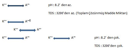Yukarıda şematik olarak görüldüğü gibi düşük pH ve düşük TDS durumlarında anyon ve ktyaon birleşme ilgileri azdır. Yükselen pH ve TDS durumlarında karşı karşıya gelen anyon ve katyon oranları artacağından bu ilgi artacaktır. Sudaki çökelmeleri doğal olarak önleyebilmek için pH’ı max. 8.2’de TDS’de max. 3200 ppm’den az tutmak gereklidir.