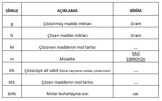 Yukarıdaki bağıntılarda kullanılan kısaltma ve işaretler aşağıdaki tabloda belirtilmiştir.