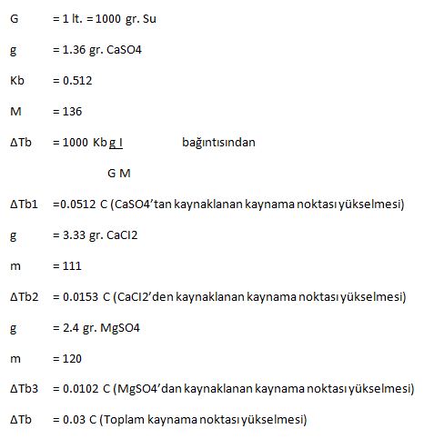 ÖRNEK : 100 C 1 lt su içerisinde 1.36 gr. CaCI2, 2.40 gr. MgSO4 içeren bir suyun kaynama noktasındaki yükselme şöyledir.