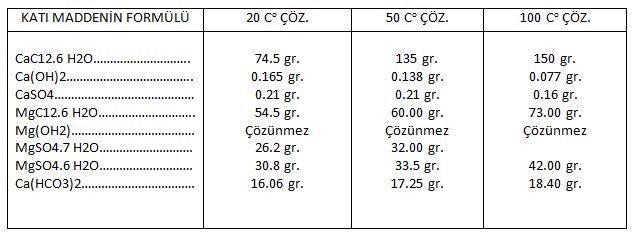 Su içerisinde çökebilecek katı maddelere ait çözünürlüğü gösteren tablo aşağıdadır.